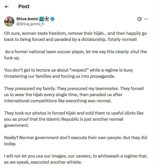 Former Iranian national footballer Shiva Amini has strongly condemned the Iranian regime following the execution of 19-year-old wrestler Saleh Mohammadi. On X, Amini criticized how athletes are forced into hijabs and used for propaganda, denouncing international voices that normalize the regime’s actions.