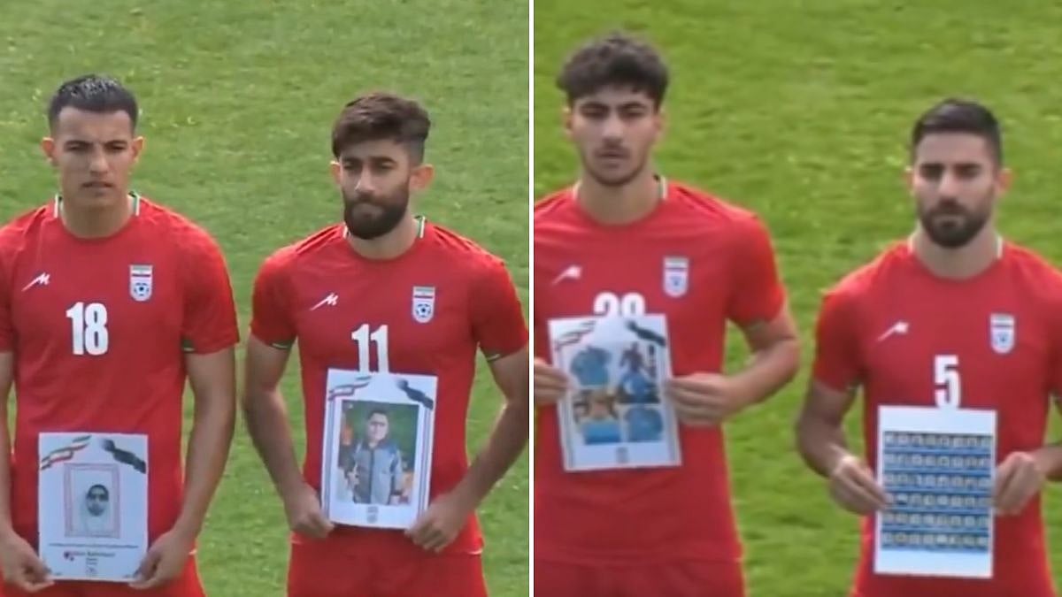 Players were joined by head coach Amir Ghalenoei, Iran Football Federation vice president Mehdi Mohammad Nabi, and team staff as they held the images during the national anthem in a show of solidarity.