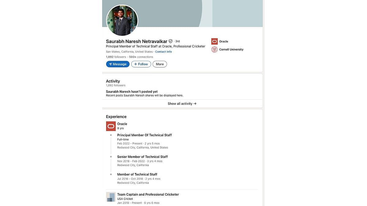 In 2018, the Indian-origin USA cricketer was promoted to the position of Senior member of Technical staff. Four years later, in 2018, Saurabh Netravalkar became the Principal member of the Technical Staff. He has been working with Oracle for eight years as per his Linkedin profile.