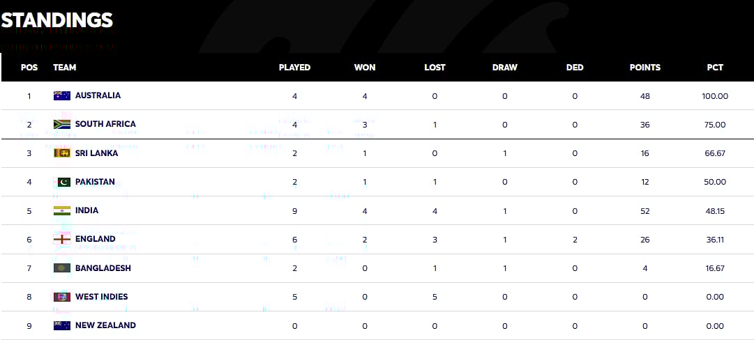 Australia continues to top the WTC points table, maintaining a perfect record with 100% PCT, having won all four of their matches so far in the current WTC cycle. The consistent performances of the Baggy Greens keep them firmly in control at the summit of the standings as the championship progresses.