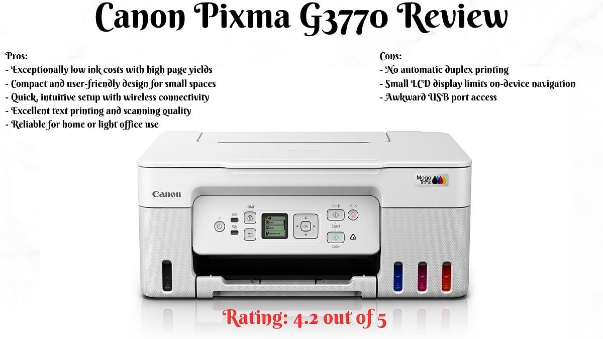 After putting the Canon Pixma G3770 through its paces, I can confidently say it's a reliable workhorse for budget-conscious users prioritising low running costs over premium polish. It earns a solid 4.2 out of 5 from me—strong on efficiency and ease, but held back by middling color vibrancy and no duplexing.
