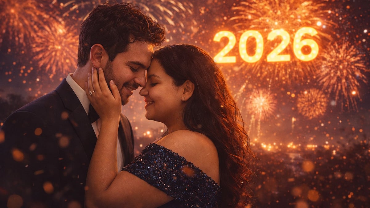 Romantic couple celebrating New Year 2026, fireworks exploding in the night sky, soft cinematic lighting, elegant outfits, dreamy atmosphere, ultra-detailed, 8K.