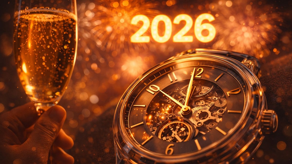 Macro close-up of a luxury transparent glass watch at midnight, reflection showing blurry vibrant fireworks celebration. Foreground: hand holding champagne glass. Overlay glowing gold '2026' floating in air. Hyper-realistic, warm golden lighting.