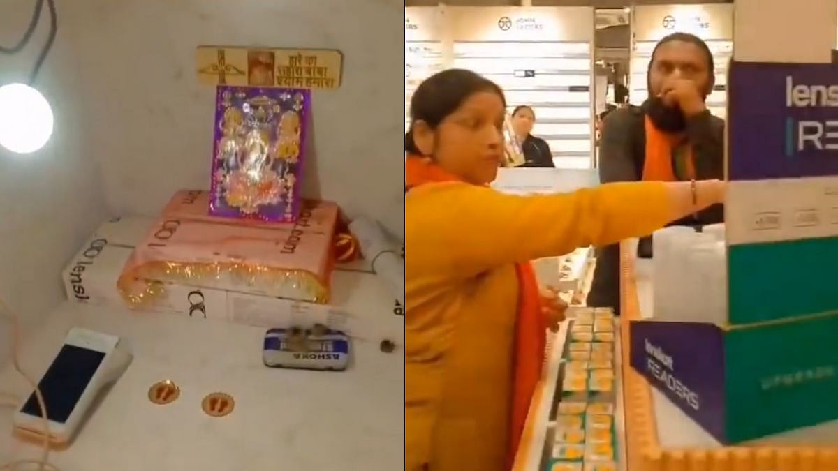 In one widely shared video from a Lenskart outlet, activists enter the store and discover a small mandir-like setup with murtis and pictures of Hindu gods concealed in a lower cupboard under the counter.