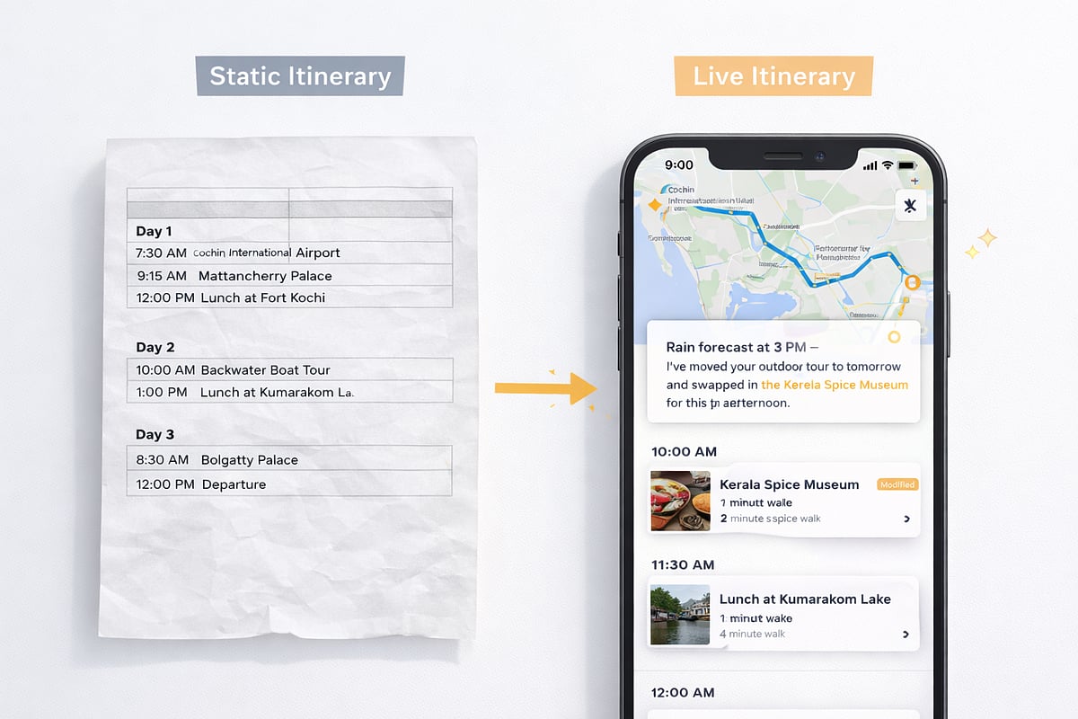 This is the category closest to my Kerala experience. The future of corporate travel is not a static PDF emailed before departure. It is a dynamic document that updates based on the traveller’s location, schedule changes, weather, and preferences - in real time.