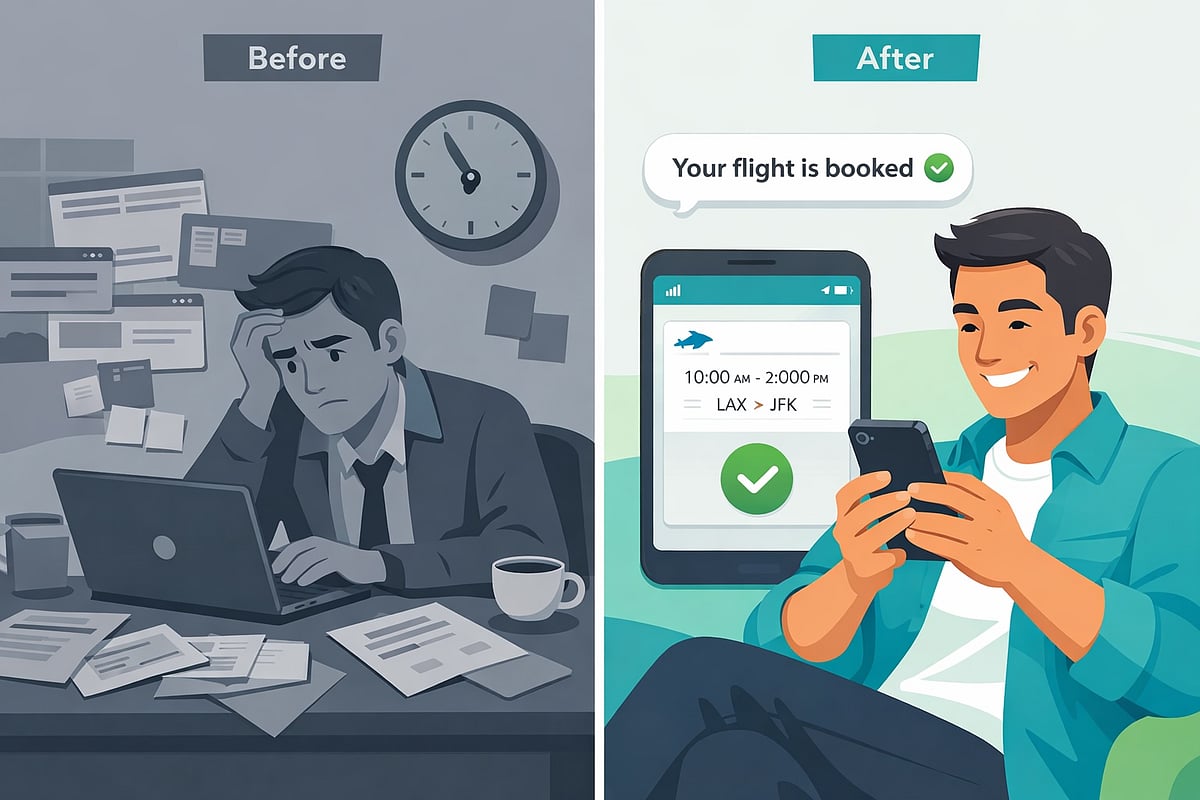 These tools do not just suggest options - they act. An agentic assistant searches inventory, checks company policy, books the flight, and sends the confirmation, all from a single plain-English request. The result: policy-compliant bookings in under three minutes, down from 15–20 minutes manually.