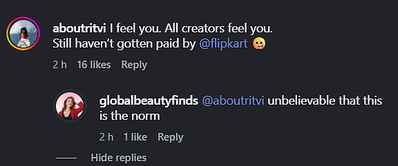Notably, beauty and lifestyle influencer Ritvi Shah (@aboutritvi) joined the conversation in the comments, specifically calling out e-commerce giant Flipkart for late payments. Other voices in the thread and related discussions highlighted issues with brands like Nykaa and even Lakme, accusing them of similar delays or, in some cases, non-payments altogether. Creators shared anecdotes of waiting months for dues, micromanagement during collaborations, and the emotional toll of repeatedly chasing payments - often feeling shamed for simply asking for what they are contractually owed.