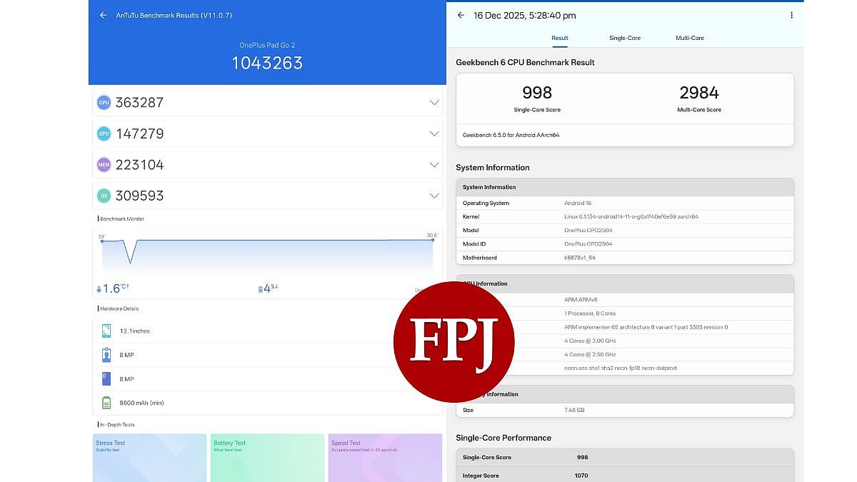 The OnePlus Pad Go 2 is powered by the MediaTek Dimensity 7300-Ultra processor paired with 8GB of RAM. The tablet delivers respectable benchmark scores, including 998 in Geekbench 6's single-core test and 2984 in multi-core performance. The AnTuTu overall score of 1,043,263 suggests this is a mid-range chipset designed for everyday tasks rather than flagship-level performance. The GPU manages a modest 2292 in OpenCL benchmarks, which indicates adequate but not exceptional graphics capabilities.