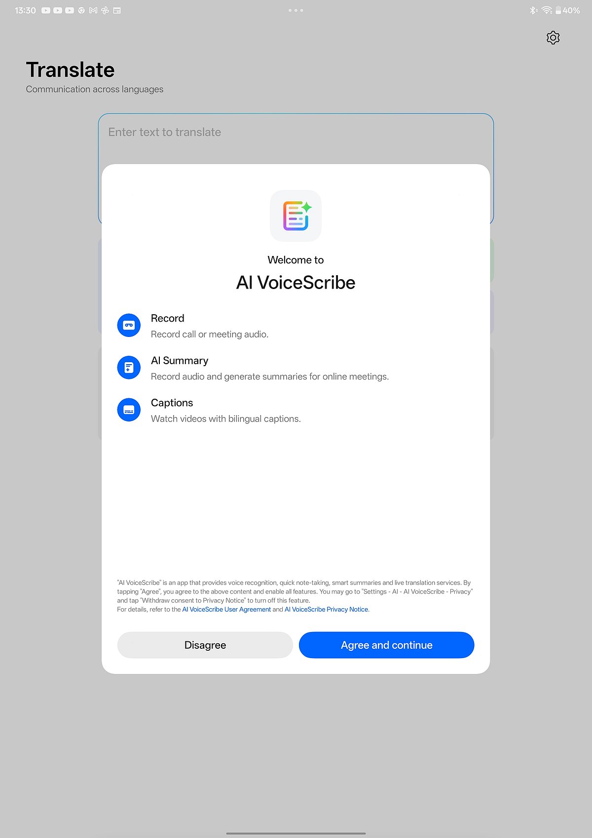 Settings now has a shiny "AI" section that centralises all new smarts: toggles for AI Writer, VoiceScribe, Translate, and Recorder, plus privacy controls for data usage.