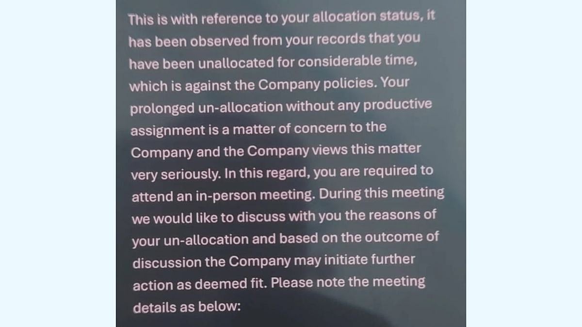 The email, shared on Reddit by the fresher, stated that the employee had been unallocated for a considerable time which violated company policies. It described the situation as a matter of 'serious concern' and required the employee to attend an in-person meeting. The purpose was to discuss the reasons for unallocation. It added that further action could be taken based on the discussion outcome. The fresherand their friend had been allocated for a long time but faced issues with project calls. Some calls came but led only to reallocation requests.