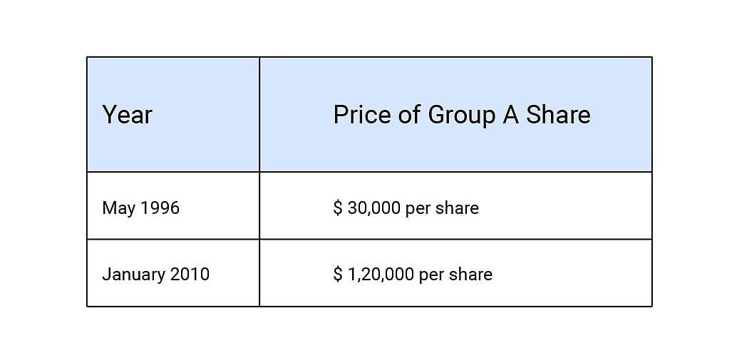 As you can see, in 2010, the share price of group A was trading at $1,20,000 per share which is 1,500 times that of group B.