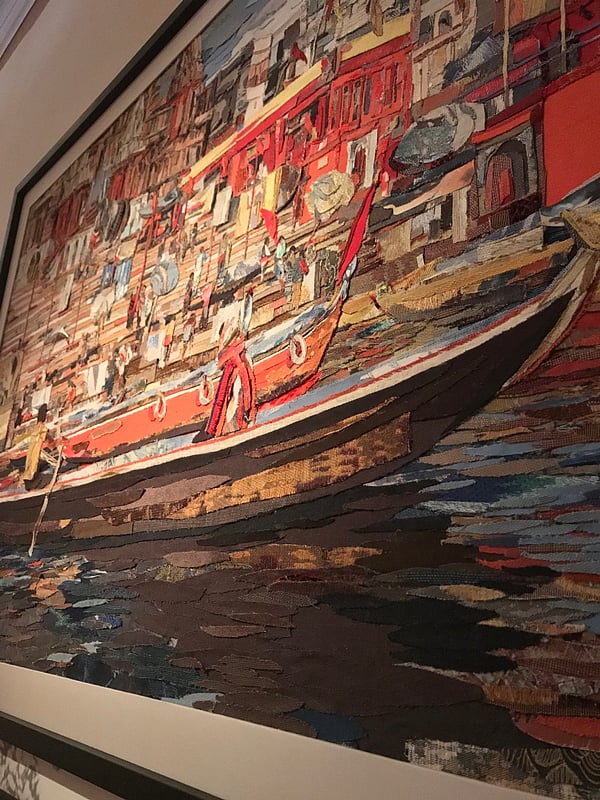 I was intrigued by the landscapes, seascapes and human portraits displayed on the walls. They looked like paintings rendered with confident brush strokes – but when I examined them closely, I realised that they are collages created with layers of textile waste painstakingly sourced, cut into strips and pieced together like a jigsaw puzzle.