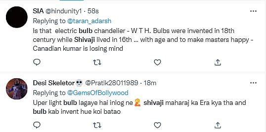 Did you get the catch? No worries, we'll spill the beans if you couldn't spot it the eagle's way. Netizens took to troll the scene of the actor walking as Chhatrapati Shivaji Maharaj, and the reason can be traced to the error in the background settings. Several tweets took a dig into the visuals and questioned whether electricity and bulbs happened to be there in those times when the Maratha emperor ruled. The chandelier which stole the spotlight from Akshay Kumar's gracious walk seemed to have bulbs fitted in it, which probably were invented much later.