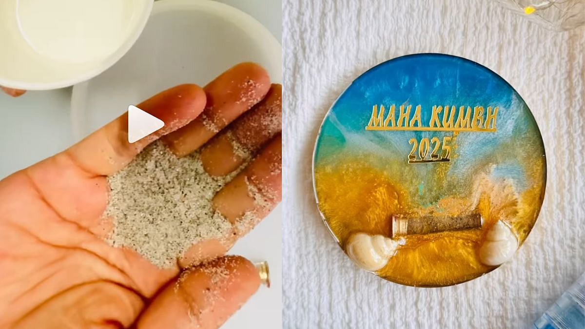 Many people are bringing home holy water and sand from Triveni Sangam, however, an artist who visited Maha Kumbh Mela found a creative way to store these precious things brought from the divine spot. Instead of sealing the water in a bottle and storing the sand in a pouch, this art lover preserved them by creating resin art.