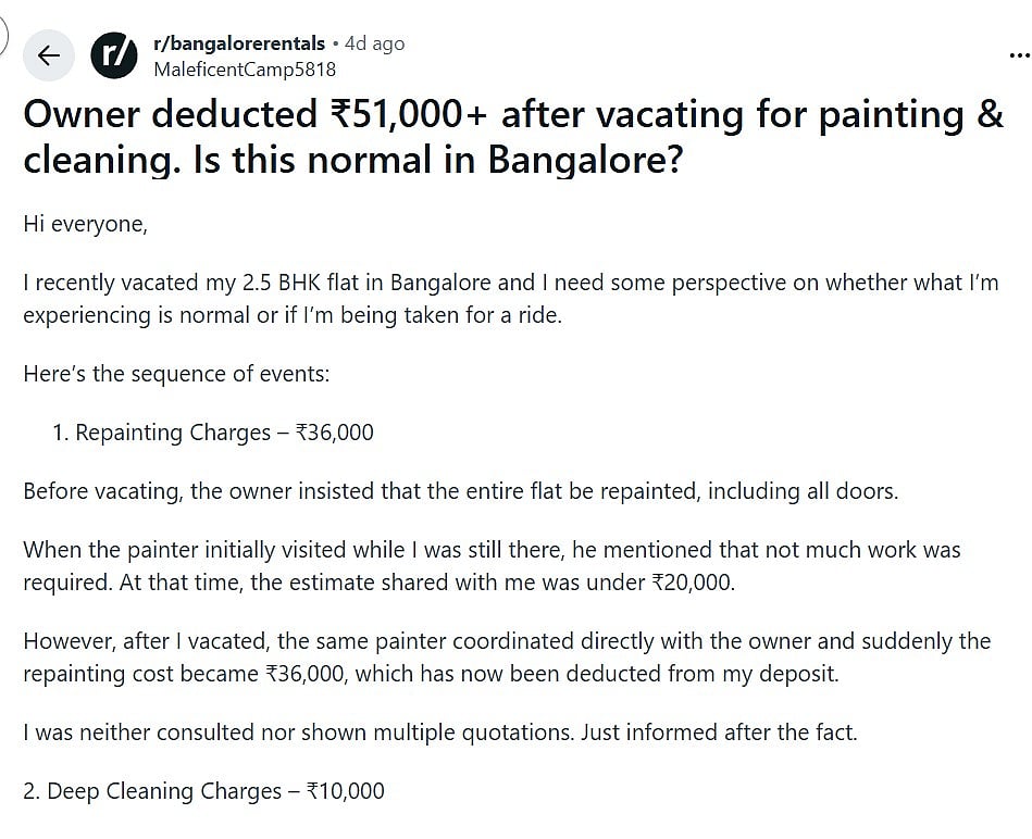 A tenant in Bengaluru has triggered an online discussion after claiming that a significant portion of their security deposit was deducted while vacating a rented apartment. The case has raised broader concerns about transparency in rental agreements and whether landlords can impose such charges without prior consultation.