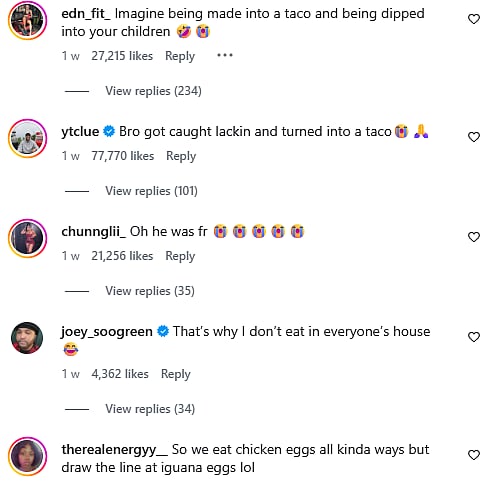 In his posts, he demonstrates various cooking methods, including making tacos filled with iguana meat. He describes the taste as similar to chicken, a reason why iguanas are locally nicknamed the “chicken of the tree.”