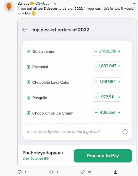 On Twitter, Swiggy has hilariously taken a dig into the customers' orders while hinting them how many times they added items to their card. While they showed that the most-ordered dessert made a 2,768,318 count, the quirky tweet tweaked the payment section to read, "₹bahotzyadapyaar."
