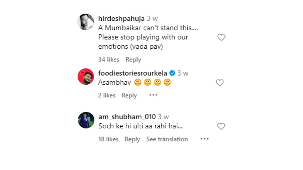 Mumbaikars who enjoy Vada Pav in their city were shocked with the food being prepared in this reel, and commented, "A Mumbaikar can't stand this.... Please stop playing with our emotions (vada pav)."