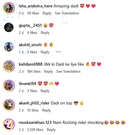As the video gained traction, users flooded the comment section with admiration and encouragement. “Amazing Dadi,” one user wrote. Another commented, “Nani rocking, riders shocking.” A third joked, “Imagine her in her prime!” while someone else dubbed her “Ultra Pro Max Dadi ji.”