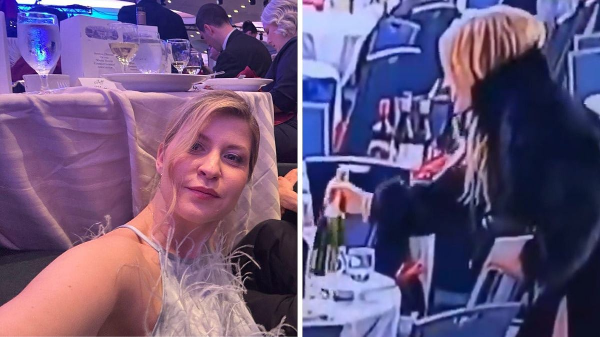 The clip, which has been widely circulated across social media platforms, shows a woman dressed in a black coat with her collar raised, reaching for a champagne bottle before deliberately picking up a wine bottle as well. The footage, captured in the midst of confusion and panic, has drawn mixed reactions ranging from amusement to criticism, with many questioning the woman’s identity and intent.