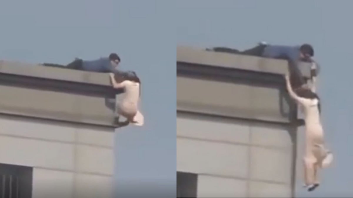Eyewitness accounts said the man quickly grabbed the woman’s hand and then held her hair with his other hand to prevent her fall. Another man soon joined in, helping pull her back to safety from the ledge.