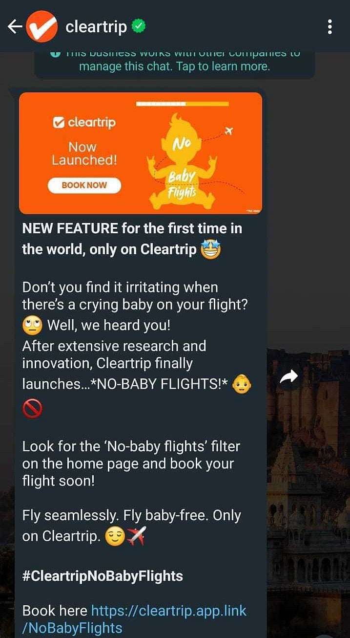 Sayak, a corporate employee from Bangalore and many other social media users received a WhatsApp message from Cleartrip that they have launched 'No baby flights'.