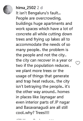 A large section of commenters highlighted the city’s shrinking green spaces. Bengaluru, once known for extensive tree cover and interconnected lakes, has experienced rapid expansion driven by population growth and infrastructure demand.