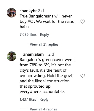 While some users empathised with her struggle, many responses were tongue-in-cheek. Several commenters joked that “true Bangaloreans” traditionally avoid air conditioners and simply wait for monsoon showers.