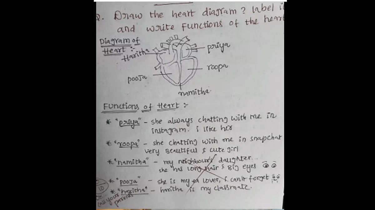 The student was asked to a answer a question that read, "Draw the heart diagram. Label and write functions of the heart." But he chose to differ from the usual answer which carried technical terms. He expressed his heart out and openly brought out what his heart had on his answer paper. What do we really mean by saying so? You might have already guessed it right that the boy penned down the names of the girls he had feelings for. With the diagram, he suggested that these girls resided in his heart and the organ comprised of them.