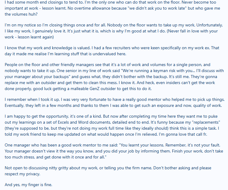 According to the employee, he was the only person on his floor capable of handling certain financial closing activities. What initially seemed like professional reliability eventually turned into a burden. He reflected that becoming “too important” in an organisation can sometimes backfire when proper team support or backup systems are missing.