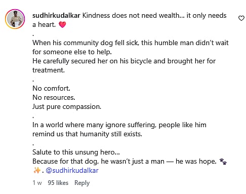 In the video posted on Instagram, the man is seen gently lifting the unwell dog onto his bicycle before setting off through city streets to seek medical treatment. Without access to a car or specialised rescue equipment, he relied on the only resource he had, his cycle, proving that willingness to help matters more than convenience.