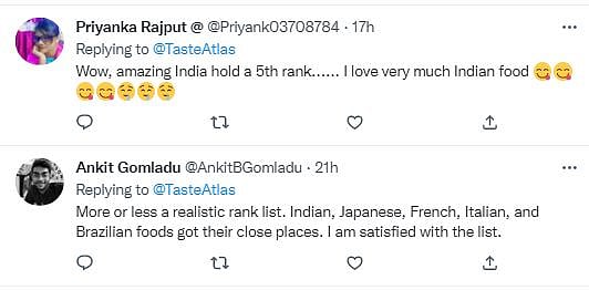 "Indian food should be number," read another tweet while suggesting its variety, ingredients and taste being unmatchable. "Even if reviewers r not used to Indian food, then also it can only be below Italian at number 2. That said, Spain should be much lower and Thailand should be at least in top 10 if not top 5," the tweet concluded the argument.