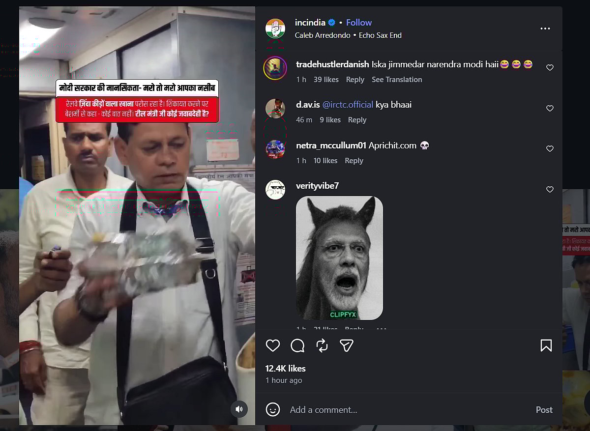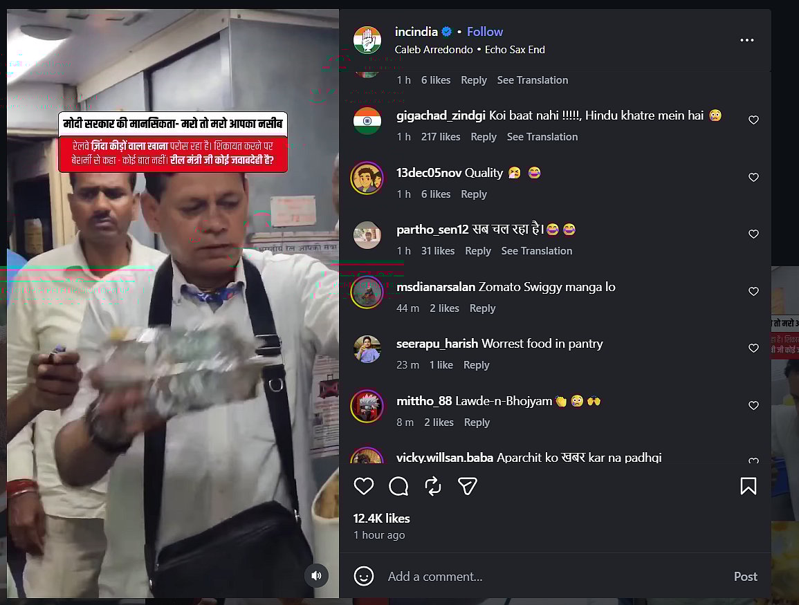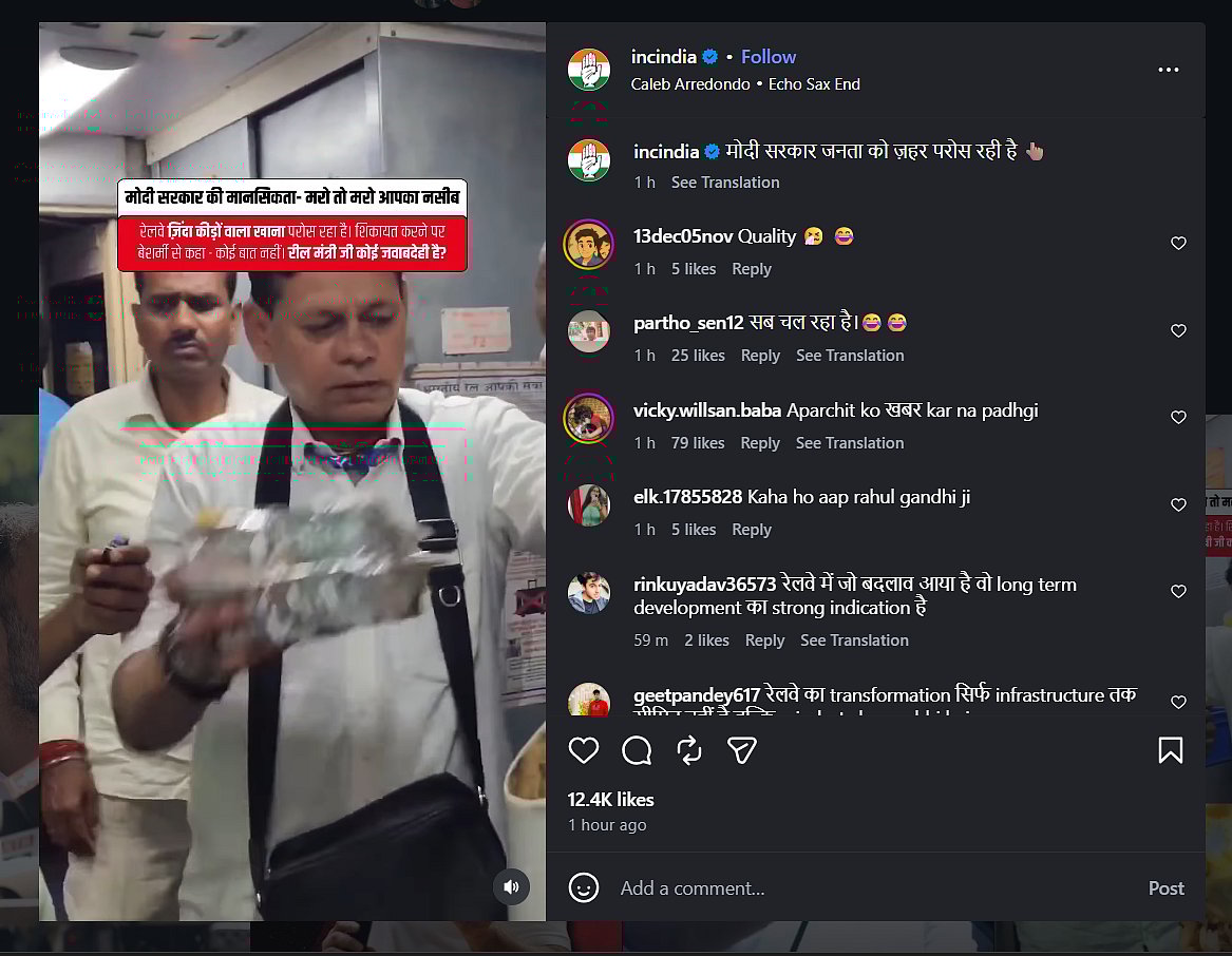 The Indian National Congress, on April 28, shared a disturbing video on its Instagram handle in which a passenger is seen strongly confronting Indian Railway staff on a train over food containing “zinda keede” (live worms). The video has gone viral on social media platforms.