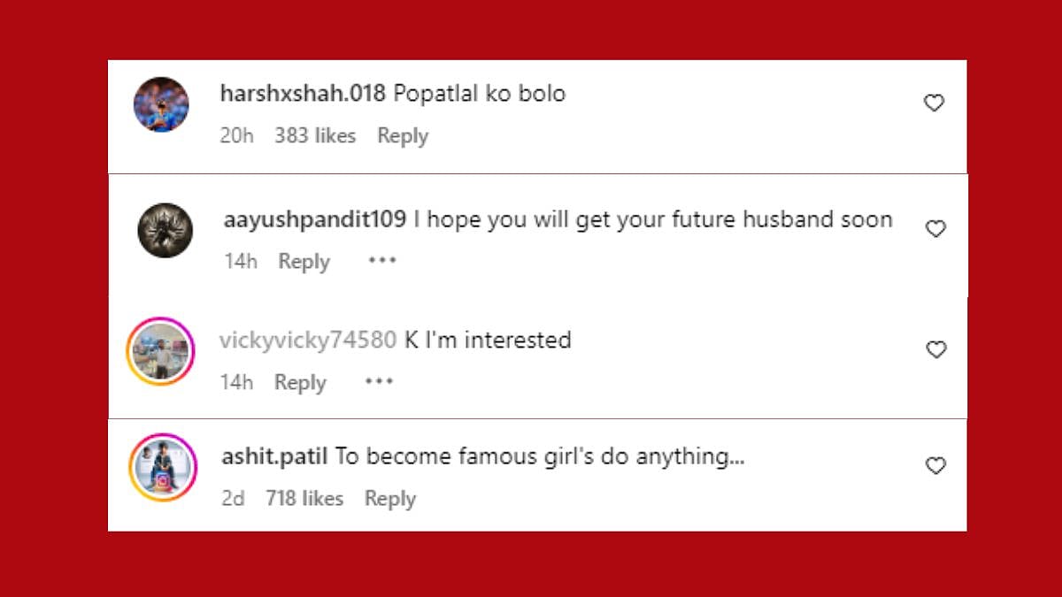 "Are are I'm ready," said an Instagram user, while another man added, "I'm interested." Several proposals surfaced in reply to her reel, which suggested she was looking for an Indian husband who was unmarried. Hilariously, some even remembered the Indian television character 'Popatlal' who has been a bachelor for a long time.