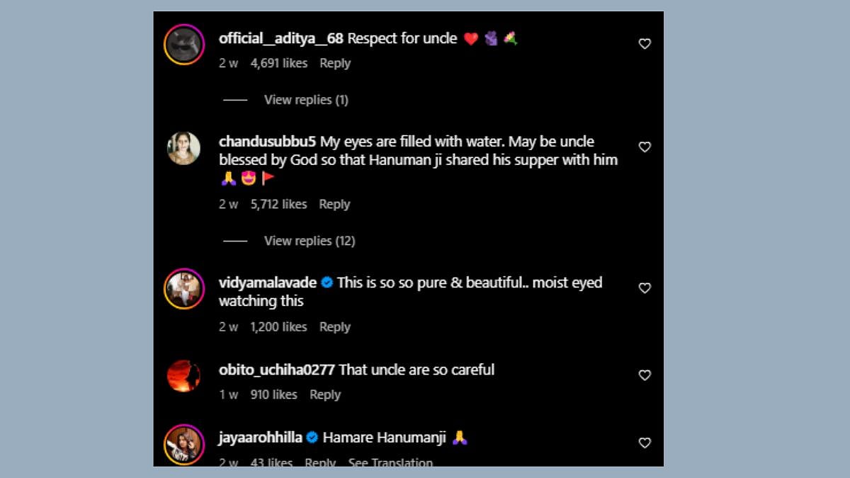 A few Instagrammers reflected on the video and suggested that the monkey was one other than Lord Hanuman himself. They wrote in joy,"My eyes are filled with water. May be uncle blessed by God so that Hanuman ji shared his supper with him."