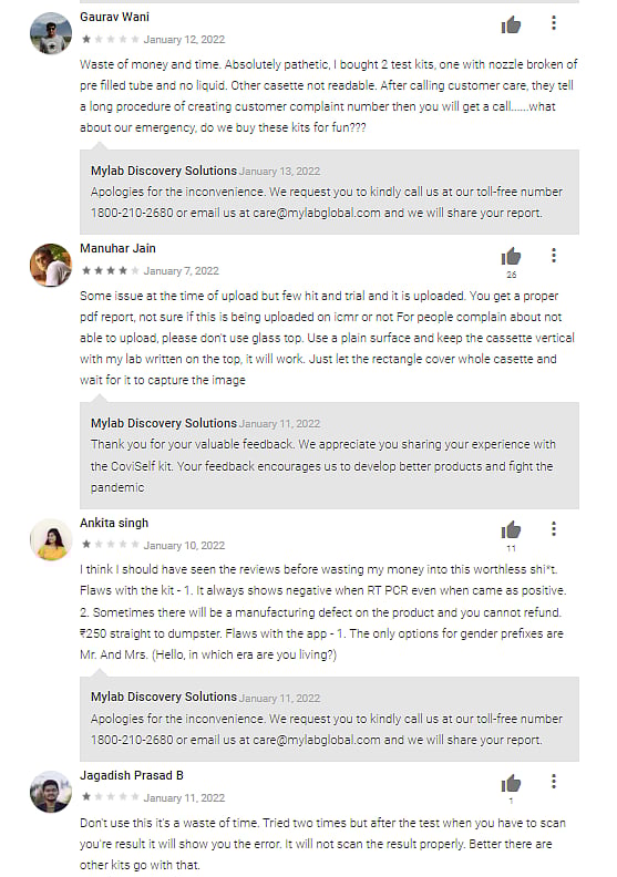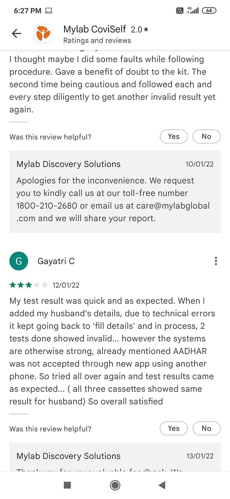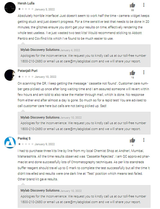Looking into most reviews, the key concern spotted and experienced by most happened to be error in scanning the QR code, delay in clicking images of the test card. Nevertheless, the feedback team of the application is spontaneous enough to reply to customers. "Apologies for the inconvenience. We request you to kindly call us at our toll-free number 1800-210-2680 or email us at care@mylabglobal.com and we will share your report, read the reply from the creator Mylab Discovery Solutions.