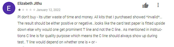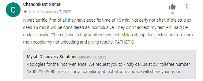 "It was terrific, first of all they have specific time of 15 min. Not early not after. If the strip exceed 15 min it will be considered as inconclusive. They didn't accept my test Pic. Said QR code is invalid. Then u have to buy another new test. Mylab cheap does extortion from common people my not uploading and giving results. PATHETIC, read a product testimonial by Chandrakant Nirmal. While, another user Elizabeth Jithu expressed their disappointment and wrote, "Pl don't buy - its utter waste of time and money."