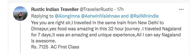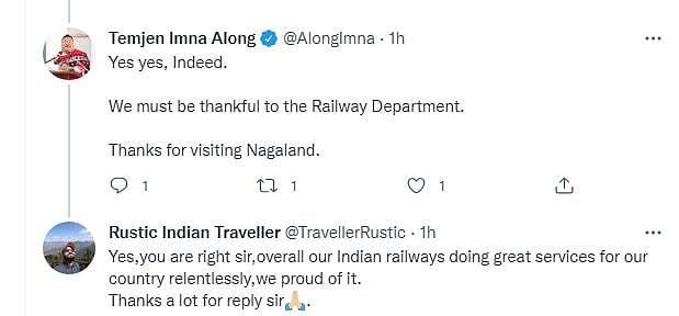 Rail Seva which is an official Twitter account for support to rail users by Indian Railways replied to the Nagaland's minister post:
