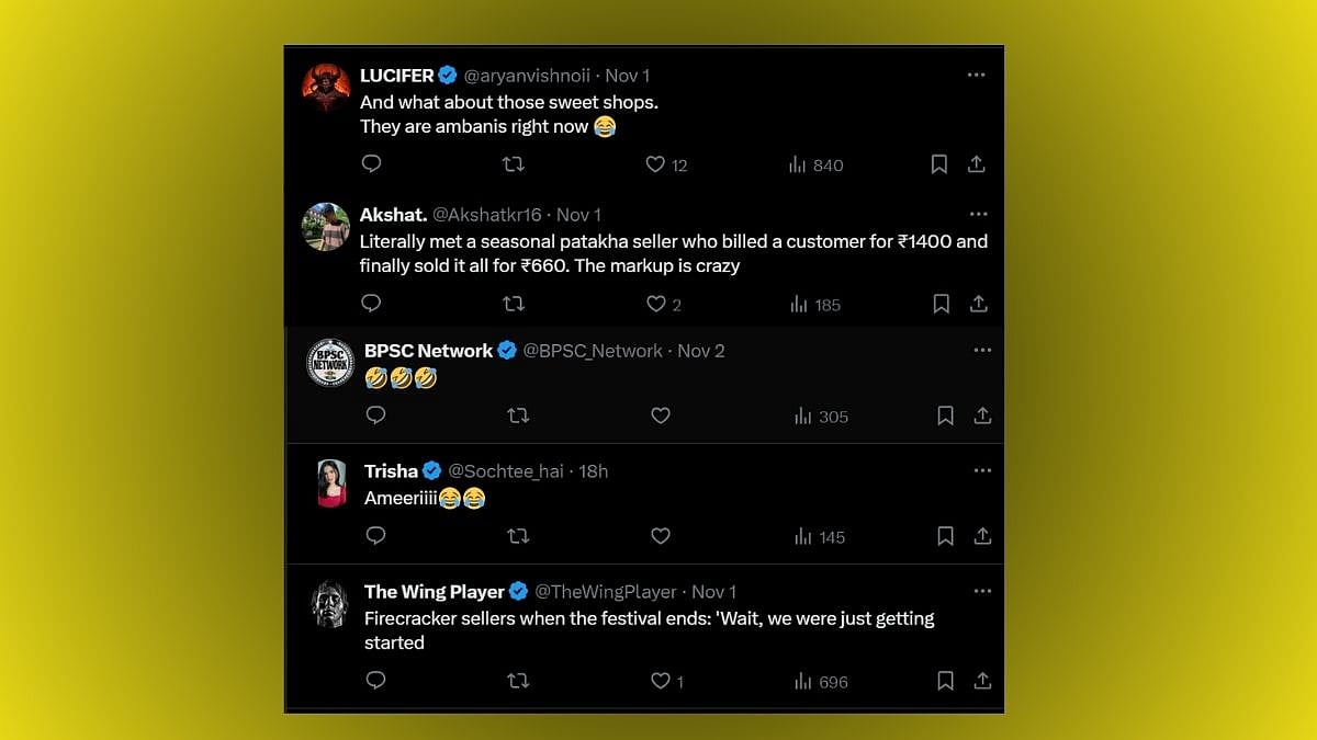 Seeing that several people were buying and bursting crackers during this Diwali, X users suggested that those selling firecrackers would have received good income. They didn't comment in a usual way about firecracker sellers earning well during the festival season, instead they pushed memes and after memes along with a few hilarious messages on the scenario.
