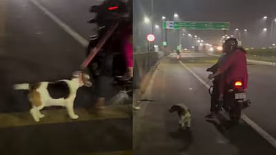 In the video, a man can be seen riding a two-wheeler with a woman seated behind him. What caught the attention of viewers, however, was a dog running beside the bike while being held by a leash tied tightly around its neck.