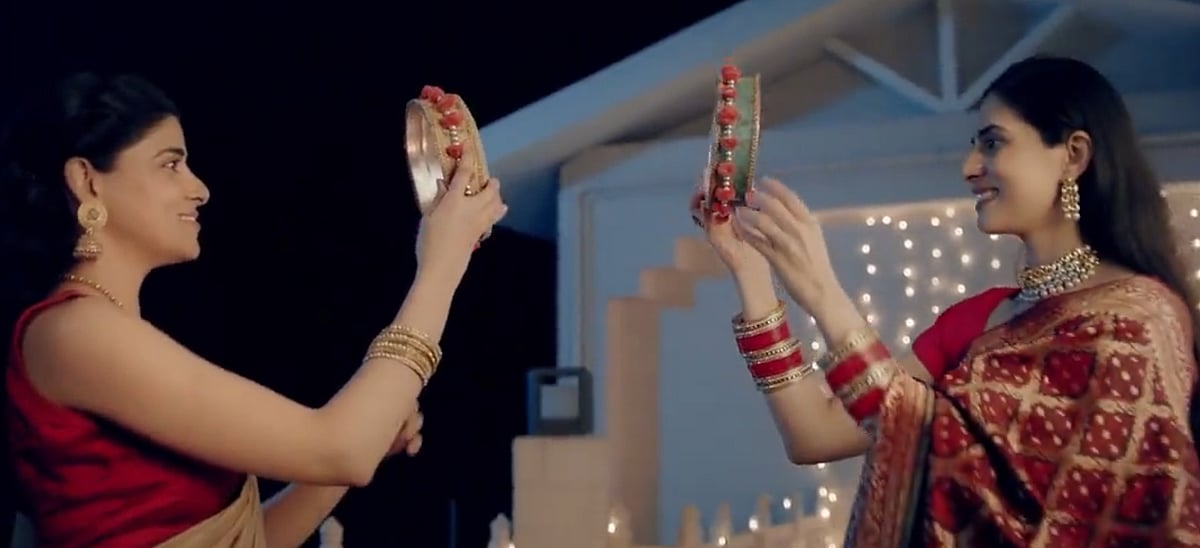 In the advertisement, two women are seen discussing the ‘Karwa Chauth’ fast. Later, they are given festive clothes by an elderly woman to wear on the ocassion. The ad then moves to the next scene which shows both the women standing facing each other with sieves and then breaking the fast by drinking water.