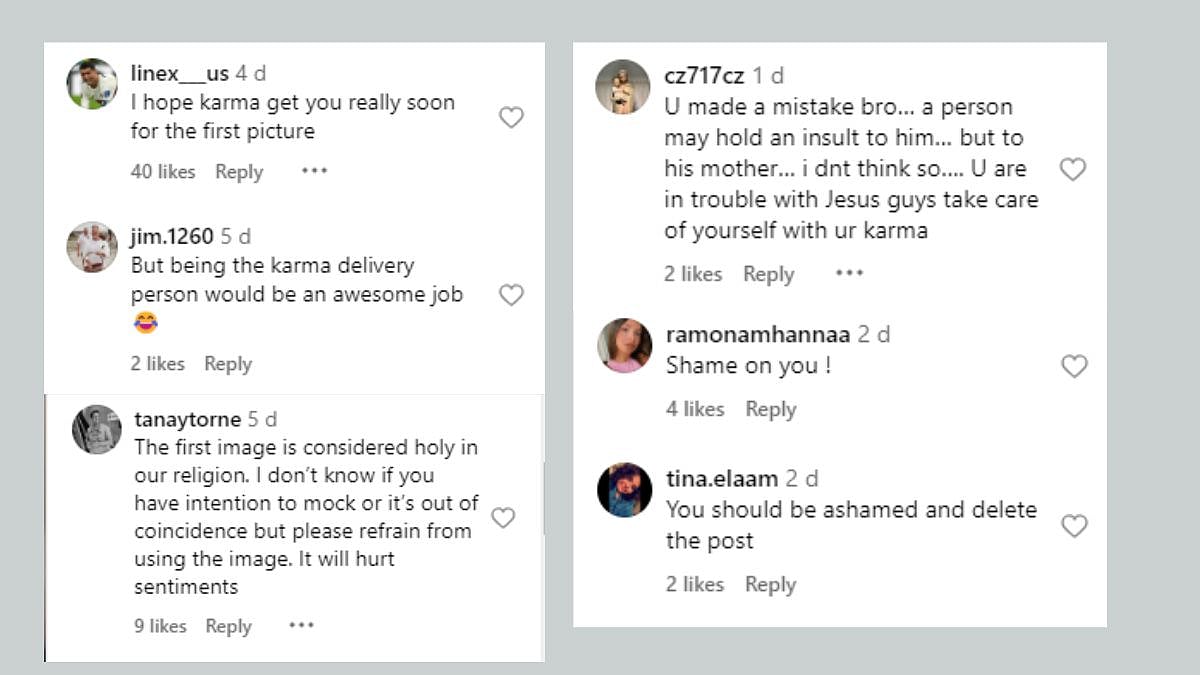 "I don’t know if you have intention to mock or it’s out of coincidence but please refrain from using the image," an internet user commented while another wrote, "I hope karma get you really soon for the first picture." Many netizens asked him to delete the post and said he should be ashamed of sharing such content that hurt religious sentiments. "Shame on you! You should be ashamed and delete the post," people said.