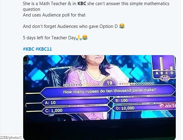 The options below the question read that 10, 100, 1000, 10,000. Sharma lost one of her lifeline at this question which, if answered correctly, would ensure Rs 3000. She got help from the audience and answered the question. Soon after the episode was broadcast, Sharma got trolled heavily on social media.