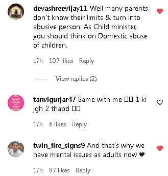 Was she downgrading the significant role of mental health experts or adding on to prevailing stereotypes? Netizens took to comments condemning her slam on psychologists, "Well many parents don't know their limits & turn into abusive person. As Child minister, you should think on Domestic abuse of children", wrote a user, while another wrote, "And that's why we have mental issues as adults now."