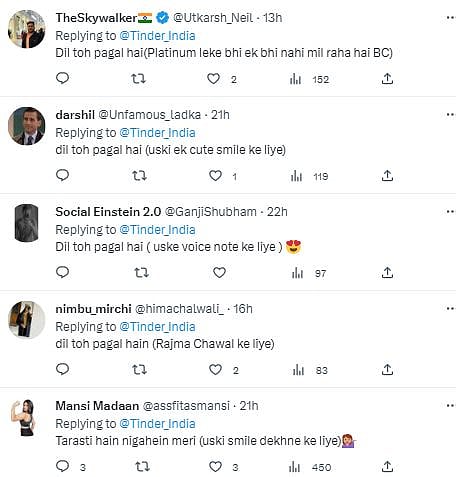 While a Twitter user wrote, "Dil toh pagal hai (uske voice note ke liye )," a foodie tweeted, "dil toh pagal hain (Rajma Chawal ke liye)." Also, netizens didn't stop there, they explored more songs and shared their feelings in the brackets. "Tarasti hain nigahein meri (uski smile dekhne ke liye)," read a reply among many other.