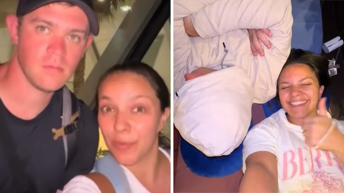 After taking a long tour at the airport, the couple finally found a place to doze off before the boarding gates opened for them to catch their flight. “We’re not supposed to sleep here, but we’re looking,” Sheri said as they roamed the airport. Eventually, they found a spot in the “Sleeper Village” alongside about 30 other overnight visitors, carefully watching over their belongings.