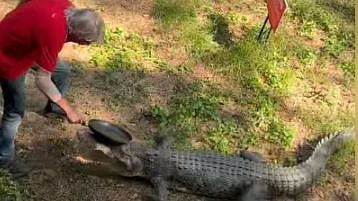 An Australian pub owner was seen fighting off a crocodile with a frying pan. The clip, posted by Storyful Viral, shows Kai Hansen with a crocodile. After the second attack, the crocodile is seen turning away towards the bushes.