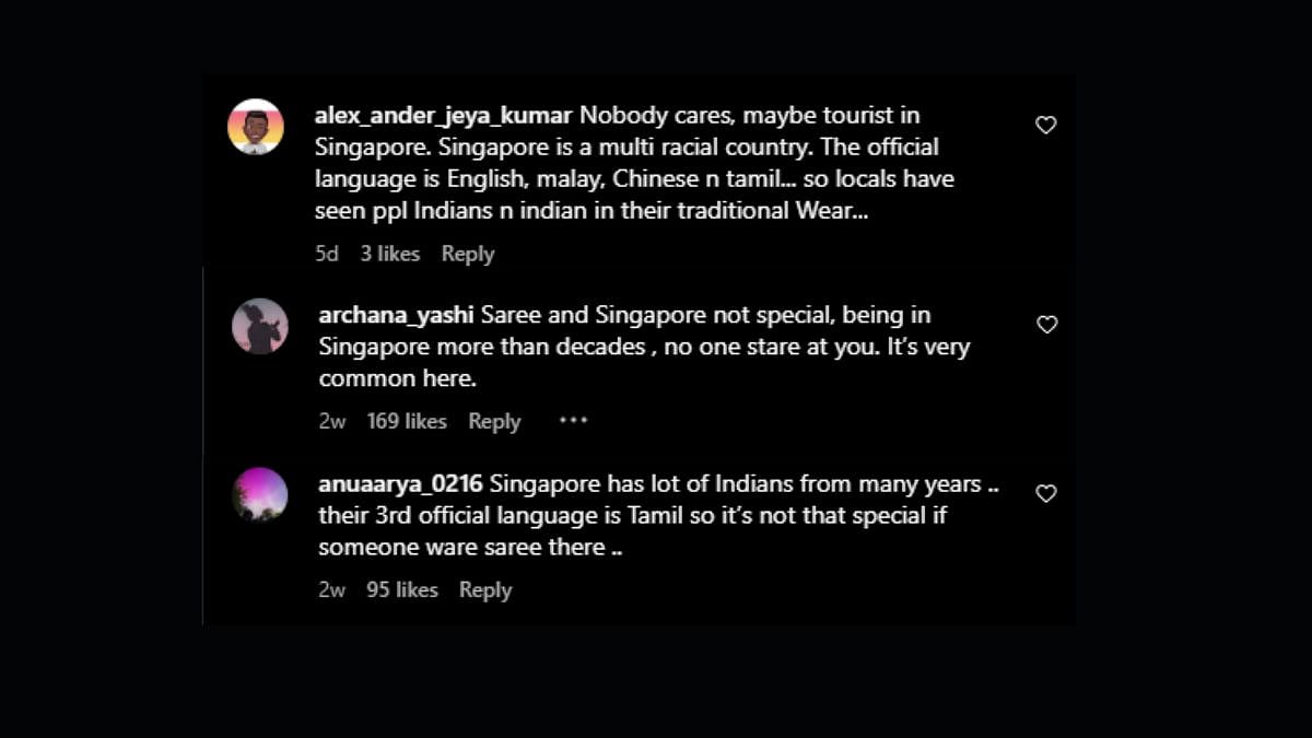 "Saree and Singapore not special, being in Singapore more than decades , no one stare at you. It’s very common here.," read a comment. Verma posted the video suggesting whether the attire is quite popular in the country. "I have been living in Singapore since years. Please don't tell me how common it is in Singapore because I already know it," she wrote.