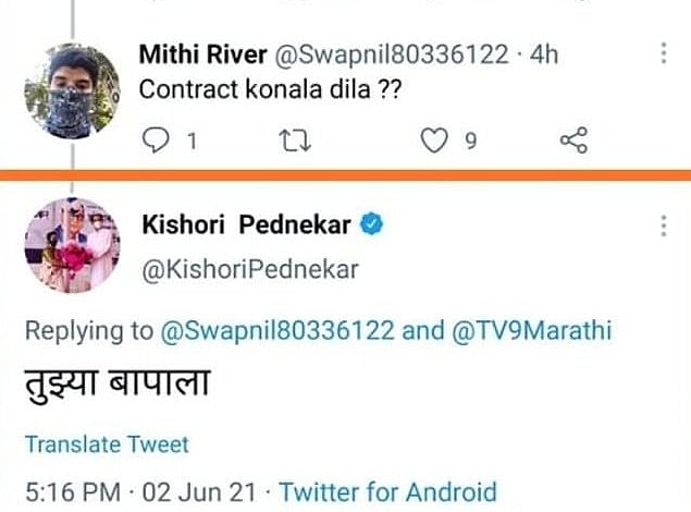 "Tuzya Bapala" (to your father) replied Pednekar when a Twitter user asked "Contract Konala dila??" (To whom contract has been given?) while commenting on a Marathi news channel's tweet regarding the Brihanmumbai Municipal Corporation's (BMC) global tender on COVID-19 vaccine supply.