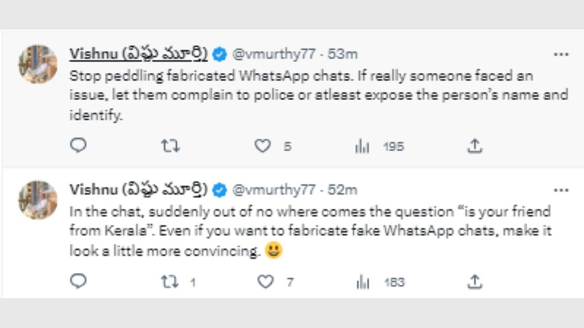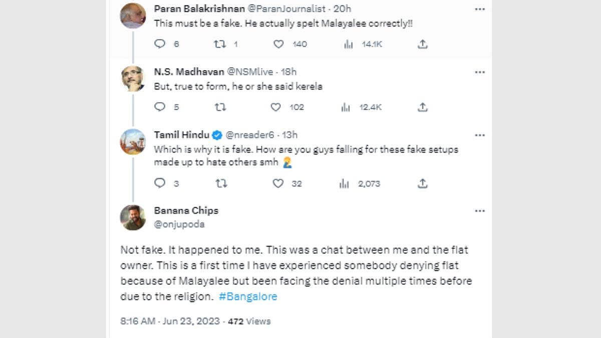 The matter also caught the attention of popular Malayalam writer NS Madhavan, among other netizens, who further circulated the unverified image on Twitter. "Sorry will not rent out to malayalees," read the chat.